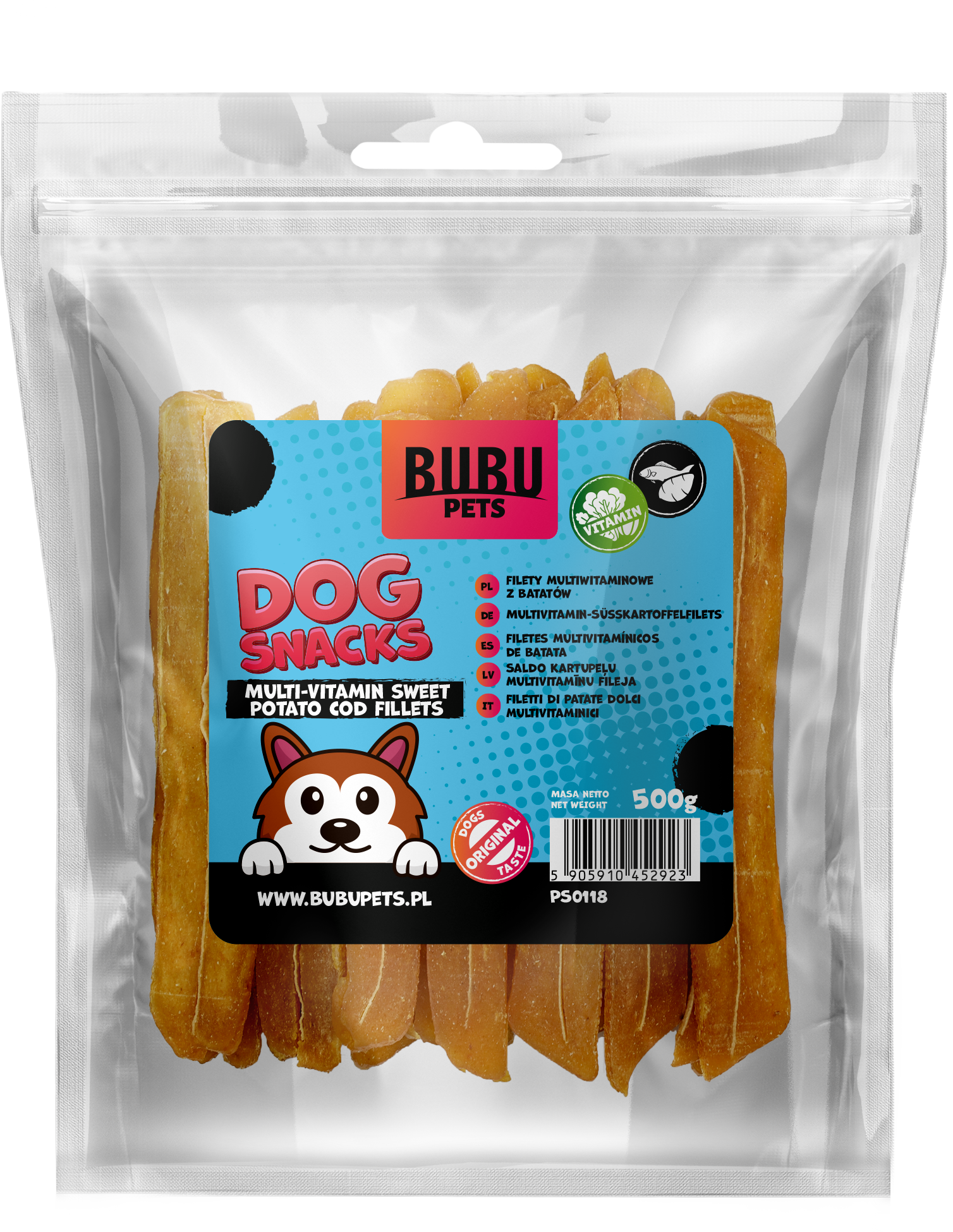 BUBU PETS suņu gardumi – vitamīniem bagātas saldā kartupeļa un mencas filejas strēmelītes, 500 g