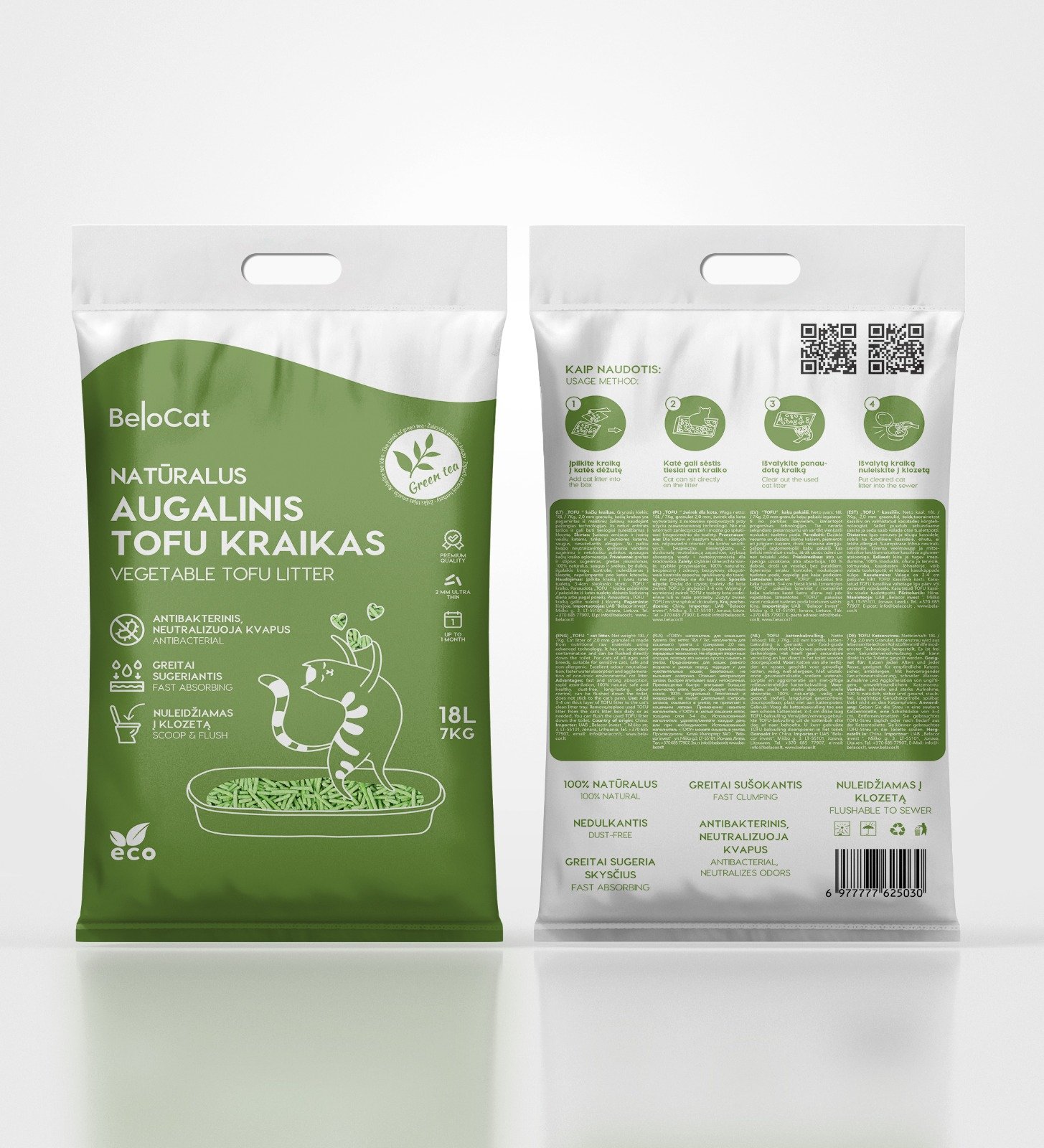 KAĶU PAKAIŠI “BeloCat” TOFU-18L/7Kg., (zaļās tējas aromāts) 100% DABĪGI PAKAIŠI