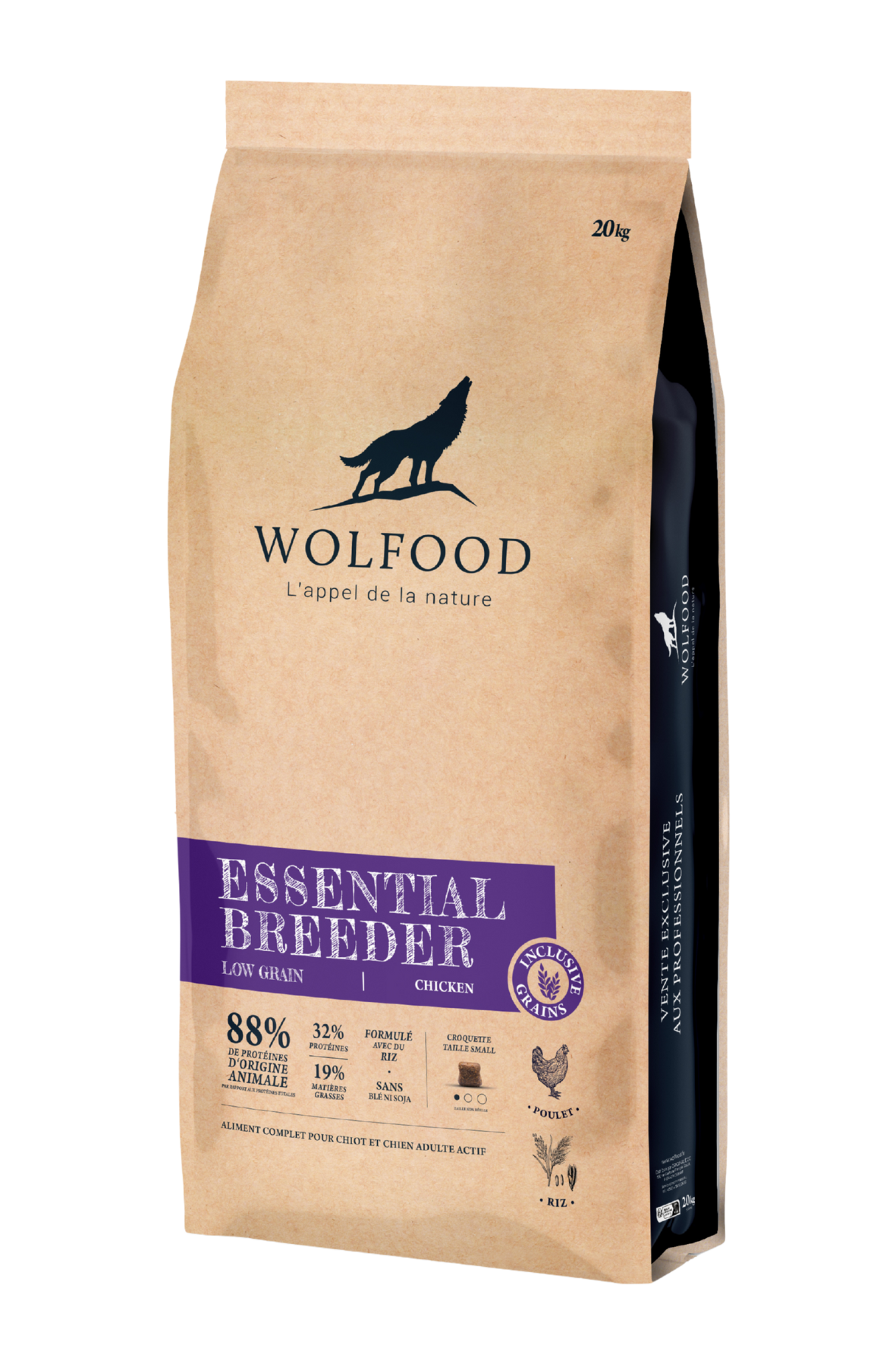 WOLFOOD ESSENTIAL BREEDER LOW GRAIN ir barība ar vistu un rīsiem, kas paredzēta audzētājiem, lielām ģimenēm, tiek piedāvāta lielā, ekonomiskā 20 kg ģimenes paka.