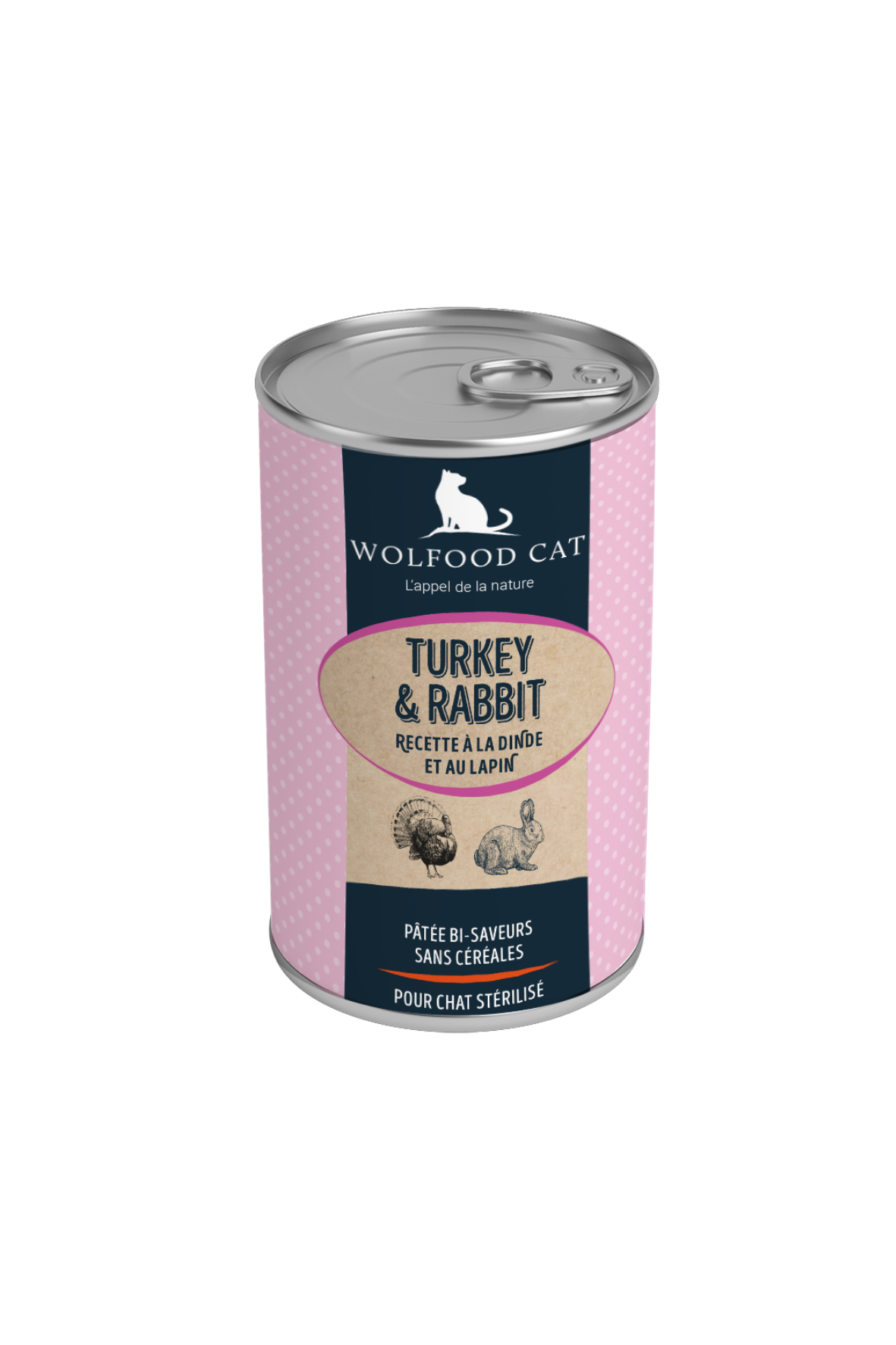 Sākums Kaķiem Konservēta barība kaķiem WOLFOOD Mitrā barība kaķiem – tītars un trusis, 0,400 kg