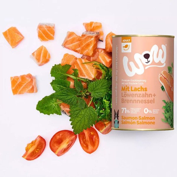 WOW konservētā barība pieaugušiem suņiem ar lasi un tomātiem ir pilnvērtīga mitrā barība visu šķirņu pieaugušiem suņiem, kas satur 71% gaļas un subproduktu, ko ražo vadošais Austrijas ražotājs. Gaļa ir papildināta ar dārzeņiem, Alpos augošiem garšaugiem un augstas kvalitātes linsēklu eļļu. Konservus pilda manuāli ģimenes vadītā Austrijas uzņēmumā, izmantojot vietējās, galvenokārt Alpu, veselīgās dabīgās sastāvdaļas.