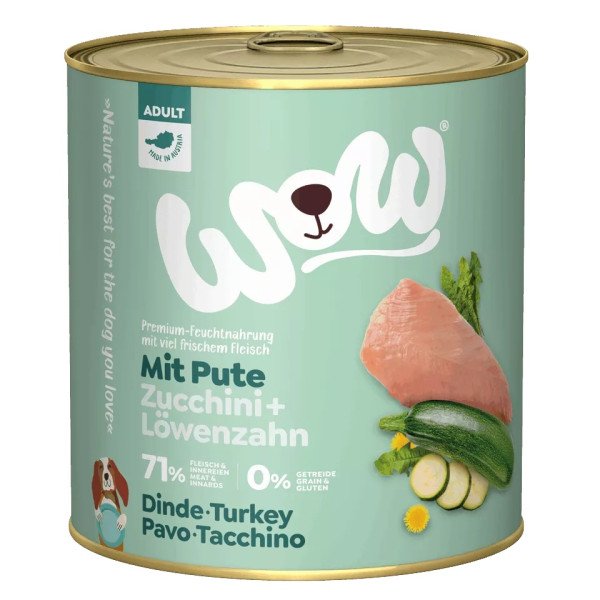 WOW Turkey – konservēta barība pieaugušiem suņiem ar tītaru, cukini un pienenēm (800 g)